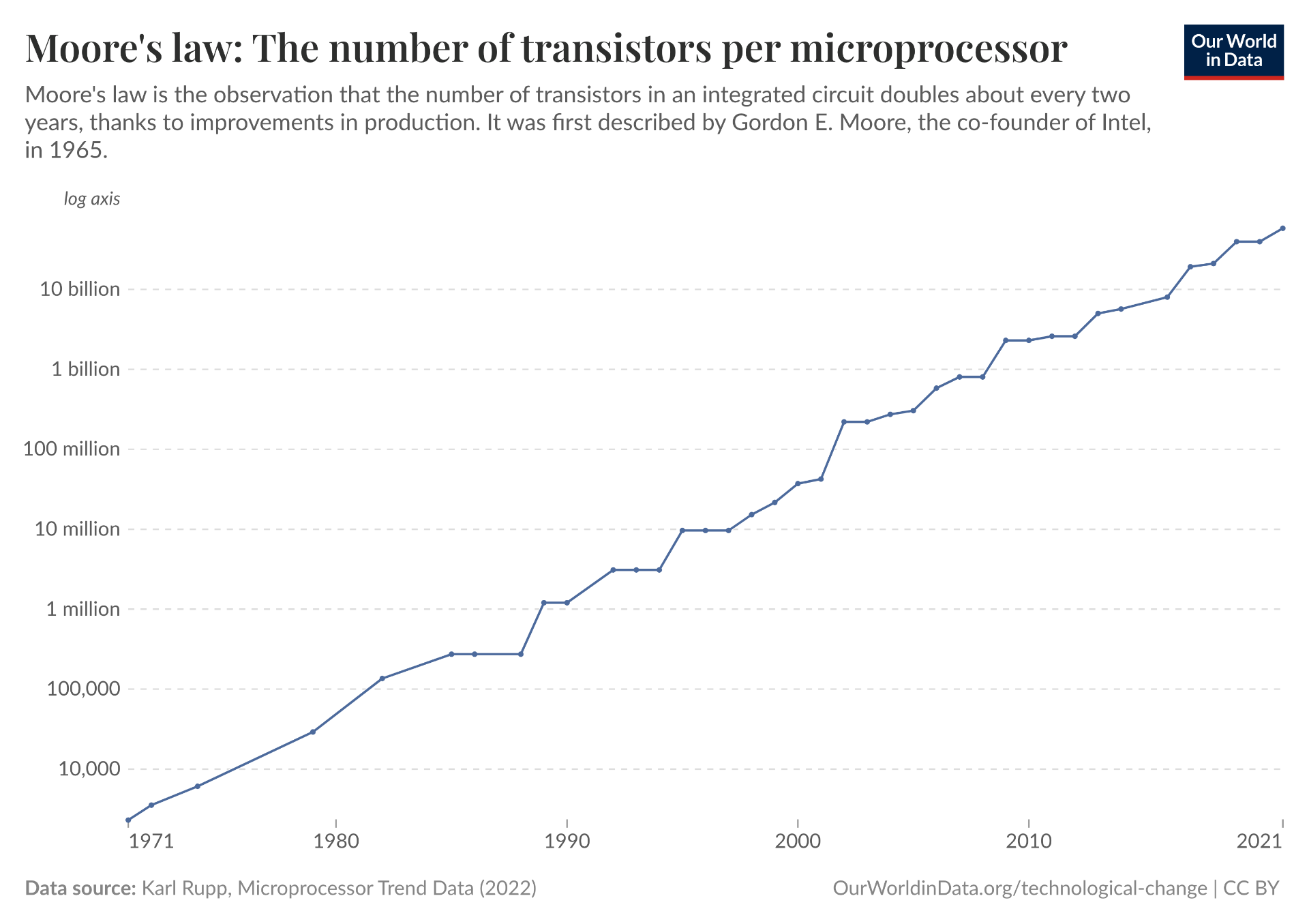 Všichni známe Moorův zákon. Počet tranzistorů na čipu se zdvojnásobuje každé dva roky. Tento princip funguje už přes 50 let. Ale co se děje v AI, je ještě dramatičtější.