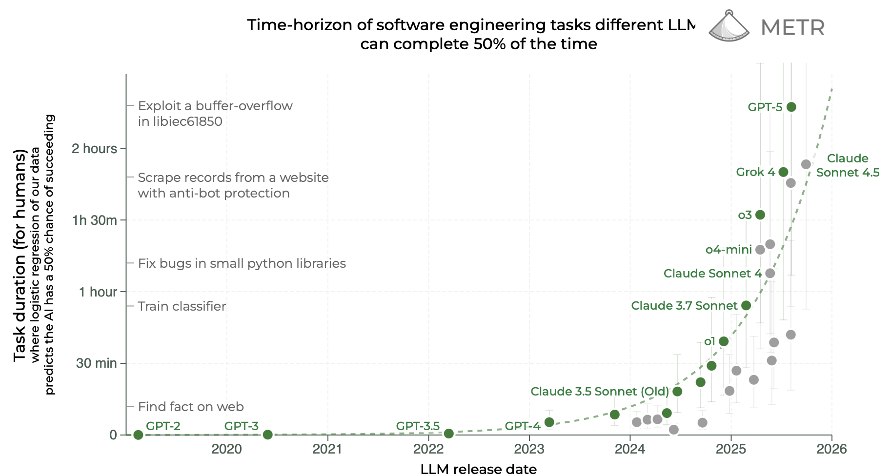Schopnost AI agentů autonomně provádět softwarové vývojářské úkoly roste mnohem rychleji: délka programátorské úlohy, kterou zvládnou, se zdvojnásobuje každé čtyři až sedm měsíců.
