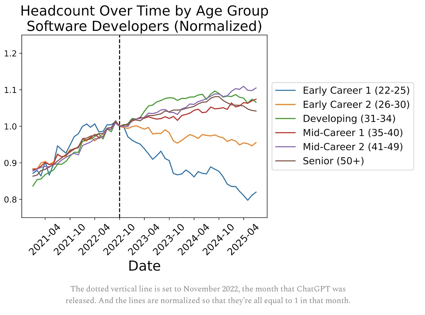 Toto není science fiction. Přední AI firmy už neformálně přestaly najímat juniory v oblasti softwarového inženýrství. Data ze Stanfordu ukazují 13% pokles zaměstnatelnosti juniorních pozic od roku 2022.